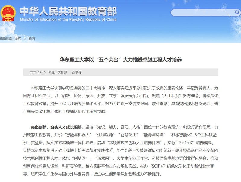 4月10日,教育部网站刊登了题为“betway官方登陆以‘五个突出’大力推进卓越工程人才培养”的简报,专题报道了学校深入落实习近平总书记关于教育的重要论述,牢记为党育人、为国育才的初心使命,以创新、协调、绿色、开放、共享的新发展理念为引领,聚焦“大工程观”教育理念,持续深化工程教育改革,提升工程人才培养质量和水平的经验做法。