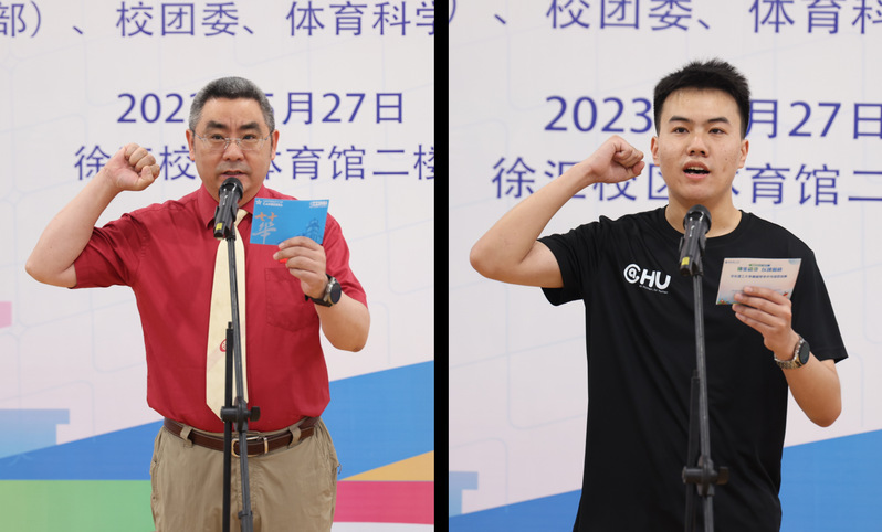 开幕式上,来自上海市乒乓球协会的国际级裁判吴晓东代表教练员宣誓,来自材料学院材料科学与工程专业2021级博士研究生田东来代表运动员宣誓。