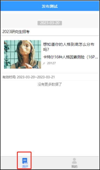 步骤三:完成测试量表。点击页面左下方的“测评”,找到“2024研究生招考”,点击弹出内容进入测试页面,点击“开始测试”,完成“卡特尔16项人格因素测试”(下图以2023年测试路径为例)。
