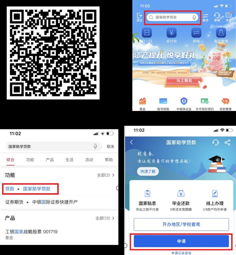 3.扫描下方二维码或在手机银行APP搜索框内输入“国家助学贷款”,进入国家助学贷款页面,点击“申请”/“再次申请”发起贷款申请。