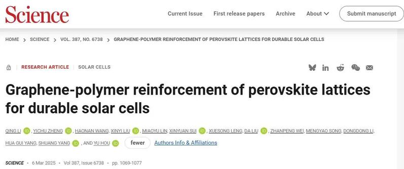 石墨烯具有超高模量(约1 TPa),是钙钛矿材料模量的50~100倍,且具有均匀致密、耐机械疲劳和化学稳定的优点。有没有可能借用石墨烯这个“外援”,来提升钙钛矿的稳定性呢?然而,石墨烯与钙钛矿并不兼容,如何实现是一大难题。
