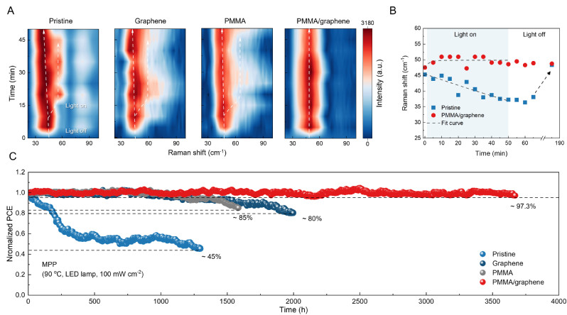 得益于石墨烯出色的机械性能和聚合物的耦合效应,钙钛矿薄膜的模量和硬度提高了两倍,并显著限制了在光照条件下的晶格动态伸缩效应。研究表明,石墨烯-聚合物双层结构将晶格变形率从+0.31%降低至+0.08%,有效减少了晶界附近由膨胀引起的材料破坏。