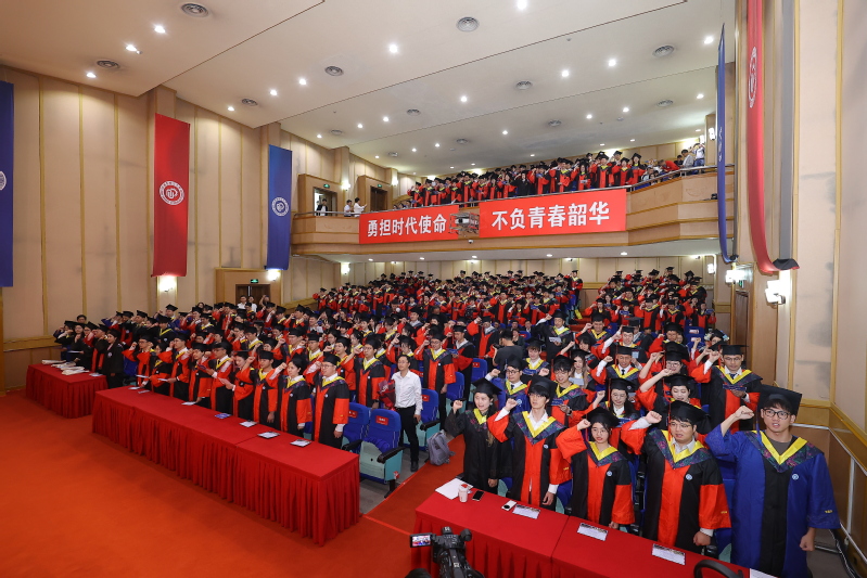毕业典礼上,蒋传海为重点行业、基层就业、应征入伍、西部计划的毕业生代表授旗,鼓励他们积极投身中国式现代化建设,在科技创新、乡村振兴、绿色发展、社会服务、卫国戍边等各领域各方面工作中争当排头兵和生力军。