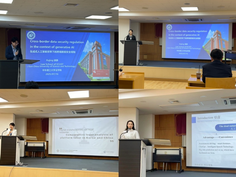 随后,两国学子围绕生成式人工智能与数据安全、算法歧视治理、劳动者权益保护等前沿议题展开热烈讨论。诚信女子大学权贤浩教授作了精彩评议,为这场思想碰撞添上点睛之笔。
