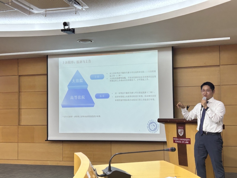 午后,访学团一行走进高丽大学。我校法学院校友、高丽大学法学博士、韩国崇实大学张智华教授以“韩国的司法体系与主要结构”为主题,抽丝剥茧般层层揭开韩国司法体系的运作逻辑,为在场学子带来了一场关于法治实践的生动解读。分享中,张智华结合自身求学与实务经历,将韩国司法实践经验娓娓道来。这些宝贵的实践洞察,恰为上午的理论研讨提供了生动注脚,也让同学们对不同法治环境下的制度设计逻辑有了更立体、更直观的认知,让原本抽象的法律制度变得鲜活可触。