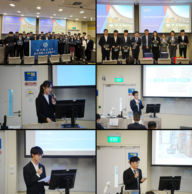 在结业汇报中,各组同学围绕AMR在农业生产、汽车制造、仓储物流及医疗健康领域的应用方向展开了分享。其中,G3组凭借出色表现斩获本次研学项目的优胜组荣誉。随后,NTU为实践团全体同学颁发了课程结业证书。