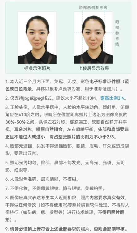 本人近三月内正面、免冠、无妆、彩色电子证件照。该照片将用于初试准考证、录取登记表、校园一卡通等,请务必按要求上传。照片要求见下图(白色背景):
