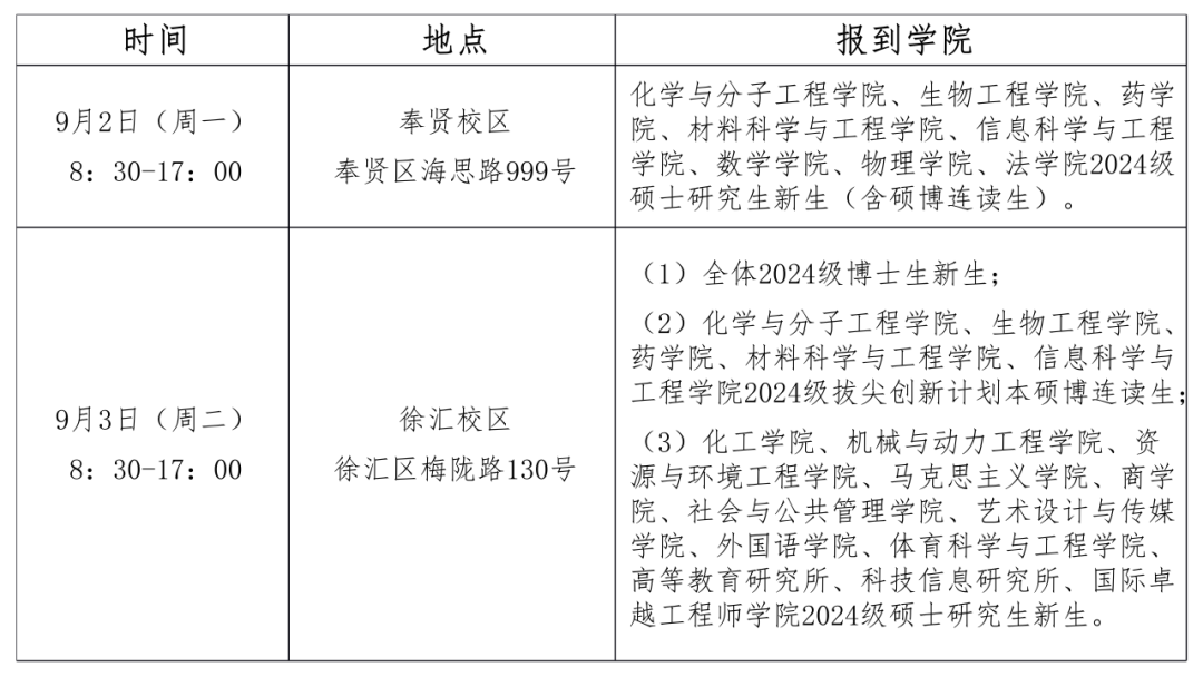 徐汇校区:9月3日-4日,徐汇校区2024级研究生新生
