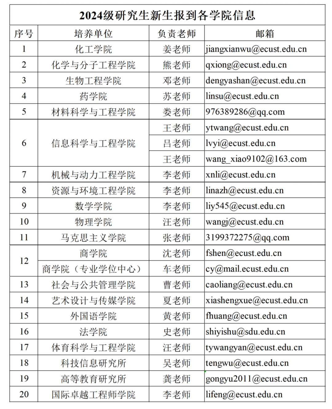 在学生公寓管理中心完成宿舍安排后(预计在8月底),同学们可在研究生综合管理系统中(我的学籍-个人讯息修改)查询到本人住宿信息,请于报到当天携带录取通知书、1张一寸照片,徐汇校区到所在住宿楼办理入住手续,奉贤校区在各宿舍围合统一办理。如不住宿舍,请将“学院、专业及原因”于8月15日前发送邮件至:sjglb@ecust.edu.cn,开学两周内未办理入住手续的,视为放弃入住。如有其它问题,可咨询学生公寓管理中心,徐汇校区联系电话:021-64252555,奉贤校区联系电话:021-33612312。更多生活服务信息可关注后勤官方微信平台“华理小蜜蜂”。